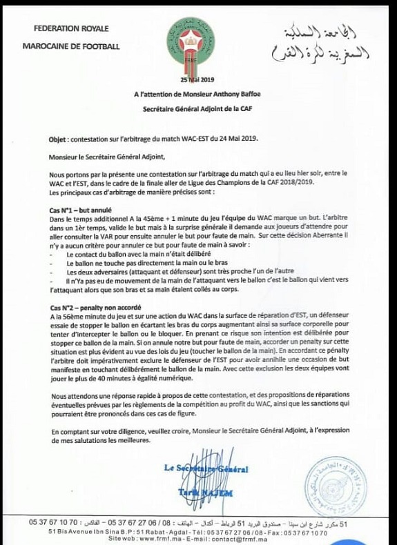 بعثت الجامعة الملكية المغربية لكرة القدم برسالة إلى الاتحاد الإفريقي لكرة القدم، تحتج من خلالها على الحكم المصري جهاد جريشة، الذي أدار ذهاب نهائي عصبة الأبطال الإفريقية، بين الوداد البيضاوي والترجي التونسي، أول أمس الجمعة بالرباط.