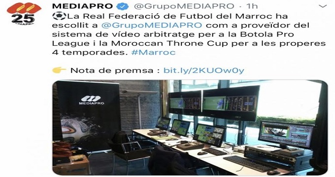 وأكدت "MEDIAPRO"، أن العقد الذي سيجمعها باالجامعة المغربية لكرة القدم، سيمتد إلى أربع مواسم، سُتشرف فيه الشركة الإسبانية على استعمال تقنية الفيديو “VAR” وإدارتها في المقابلات الخاصة بـالبطولة الوطنية المغربية وكذلك بمنافسات كأس العرش.